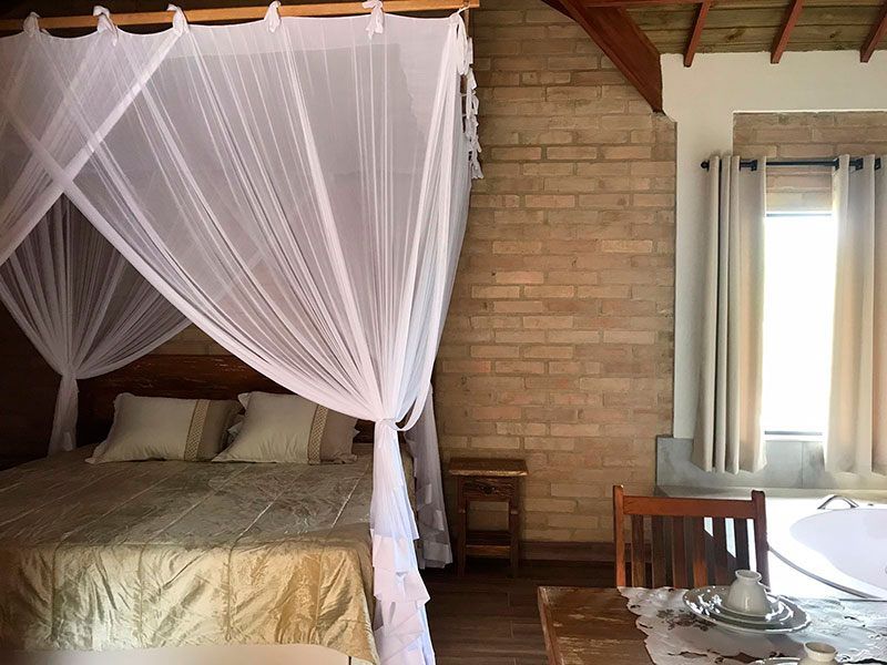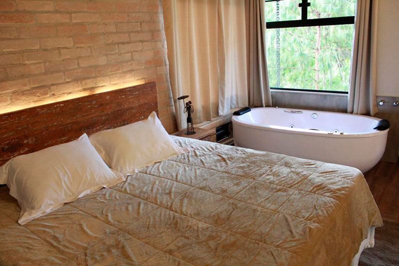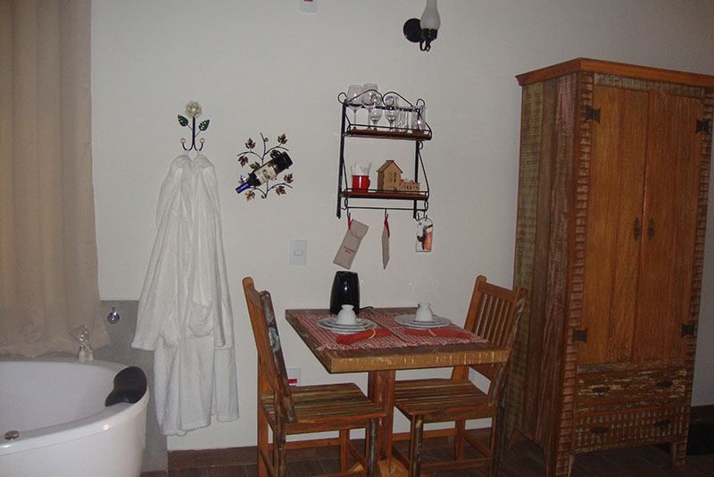 Chalé alpino com 35 m2,lareira, banheira dupla estilo vitoriano, tv, frigobar, banheiro privativo, internet, roupão de banho, toalhas e amenidades de banho.